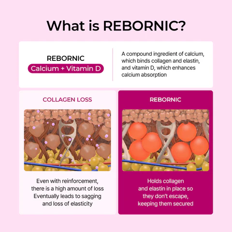 [Use of skin calcium REBORNIC patented raw material] Combining with Vitamin D, the absorption of ionized calcium is enhanced. It helps to securely retain collagen and elastin within the under-eye bone structure.